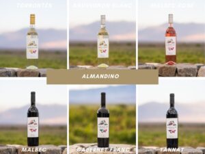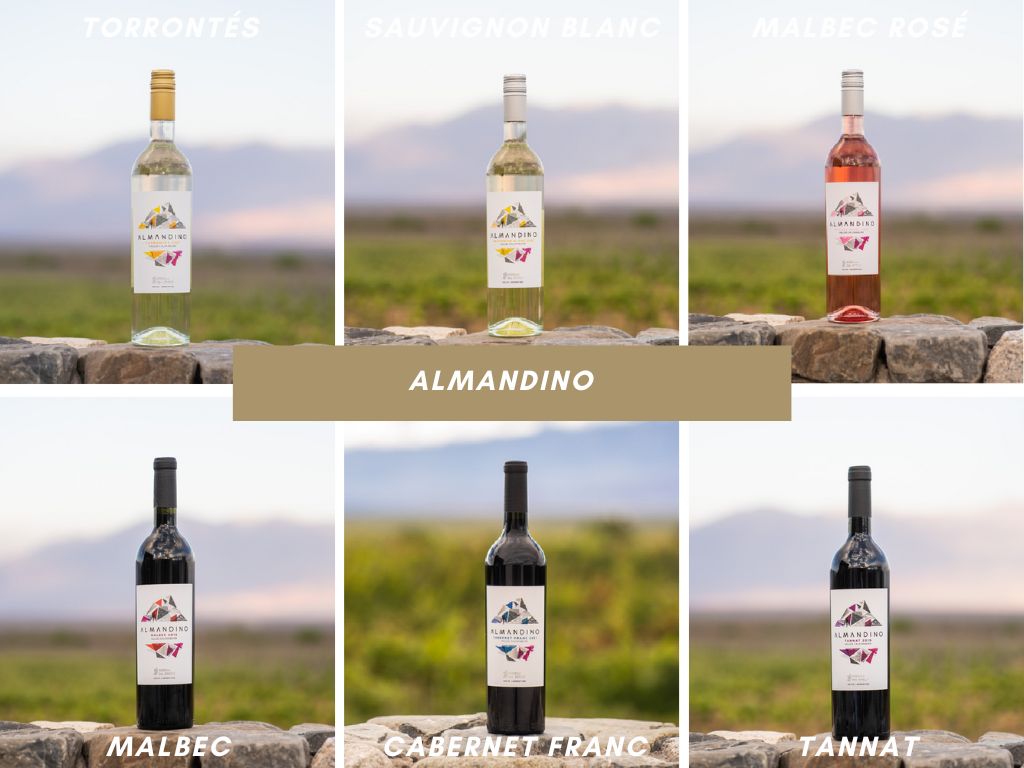 Almandino, es el nombre de la línea, referido a un mineral de la familia de los granates con gran protagonismo en su terroir, el cual representa la riqueza de la naturaleza y el espíritu de los Andes Centrales, ambos plasmados en el ADN de sus vinos.