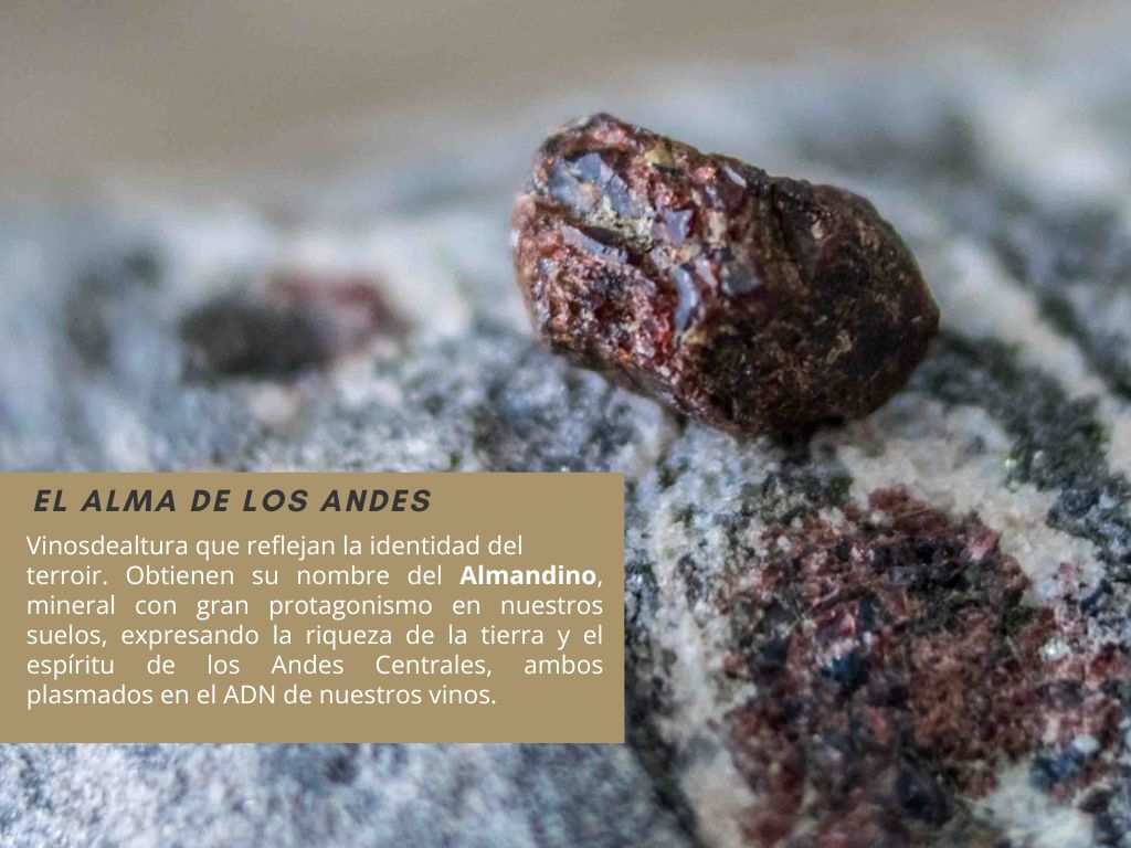 El nombre de la línea rinde homenaje al Almandino, un mineral de la familia de los granates presente en el terroir. Sus tonos, que van del magenta al granate, representan la riqueza de la naturaleza y el espíritu de los Andes Centrales, plasmados en el ADN de los vinos.
