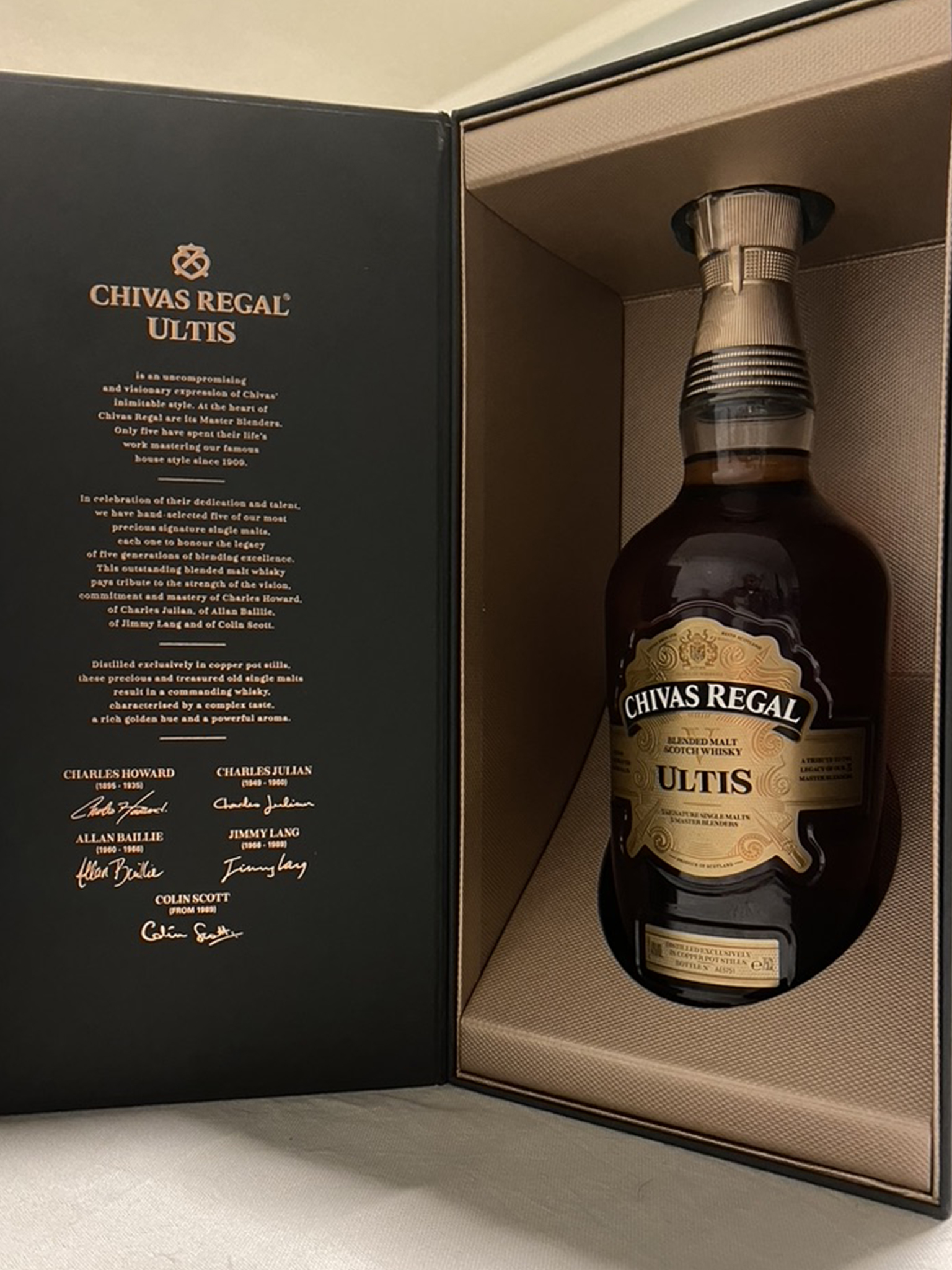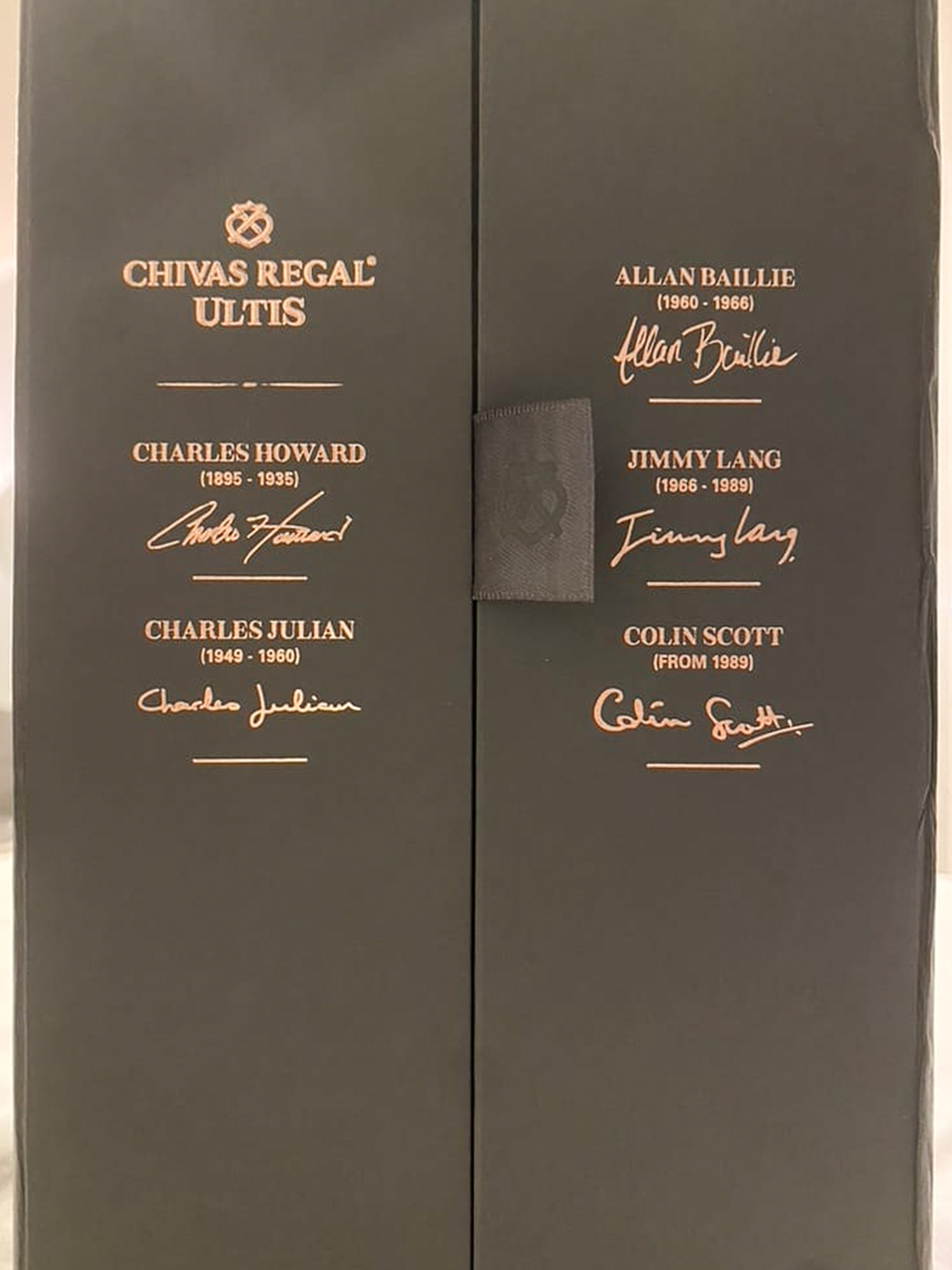 Desde 1909, solo cinco hombres han custodiado y perfeccionado el estilo característico de Chivas Regal. Cada uno, con su visión y paladar, ha dejado una señal indeleble en la herencia de la marca. El Ultis nace como una reverencia a estos 5 legendarios Master Blenders de la marca: Charles Howard, Charles Julian, Allan Baillie, Jimmy Lang y el actual master blender Colin Scott. Por primera vez en la historia de la marca, un whisky es dedicado exclusivamente a enaltecer a su talento colectivo, convirtiendo a la botella en un monumento a la dedicación y la artesanía.